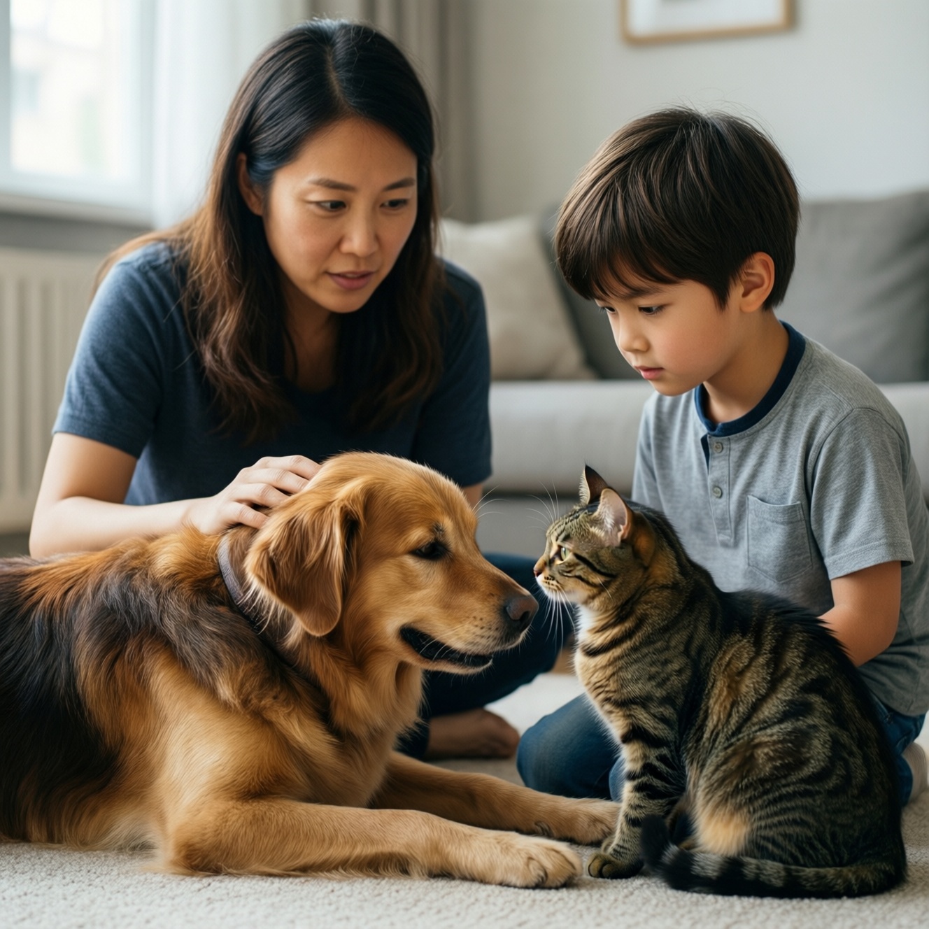 - Зонирование: "детская зона", "зона питомца", "нейтральная зона" для коротких контактов. Правило: ребёнок не подходит к питомцу в его зоне, питомца не загоняют в детскую.