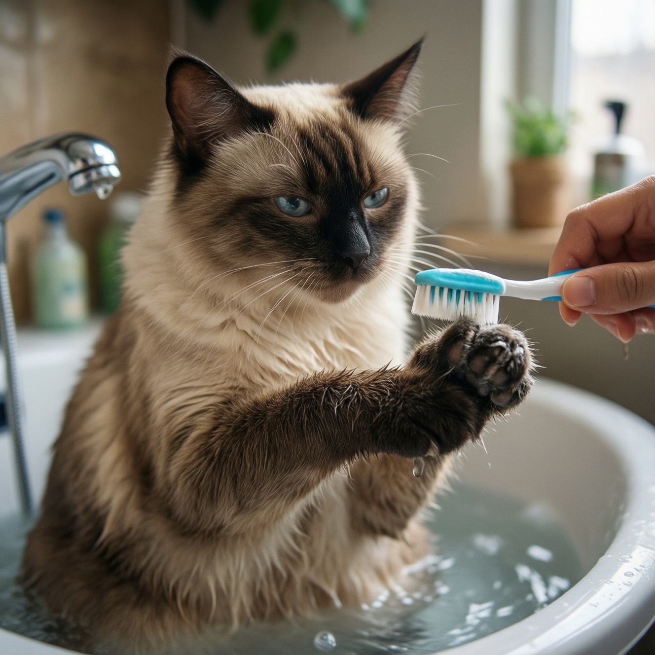 Если процедура уже стала "триггером" (кошка убегает при виде щётки или когтереза), подход всё равно работает, но начинается с более раннего шага: нейтрализация реакции на вид предмета, звук воды, запах пасты.